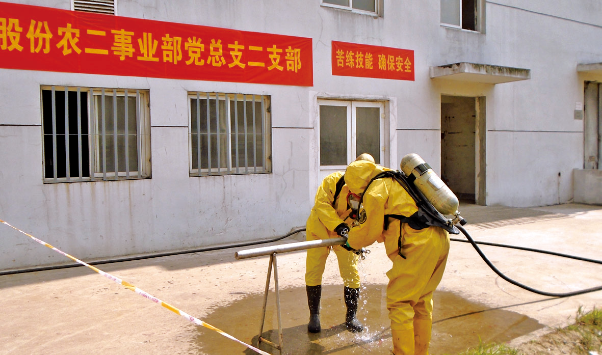 6月6日下午農(nóng)一事業(yè)部雙甘膦分廠組織氨回收送農(nóng)二事業(yè)部液氨管道泄漏預(yù)案演練,事業(yè)部總經(jīng)理孟長(zhǎng)春擔(dān)任演練總指揮。6月19日,I草丙班與雙甘膦丙班聯(lián)合進(jìn)行了液氨槽裝卸管道泄漏演練。演練前值長(zhǎng)按照以往演練出現(xiàn)問(wèn)題對(duì)原預(yù)案進(jìn)行了修改,并且進(jìn)行了泡沫消防炮、防化服穿戴專(zhuān)項(xiàng)訓(xùn)練。
