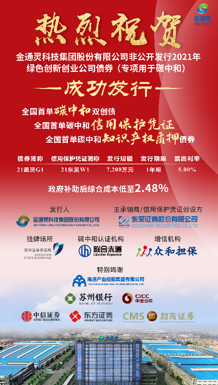 8月18日,南通產(chǎn)業(yè)控股集團(tuán)控股的上市公司金通靈科技集團(tuán)股份有限公司(SZ.300091,金通靈)非公開發(fā)行2021年綠色創(chuàng)新創(chuàng)業(yè)公司債券(專項(xiàng)用于碳中和)成功發(fā)行。債券簡稱“21通靈G1”,債券代碼“133055”,發(fā)行規(guī)模7200萬元,綜合融資成本年化僅為2.48% 。實(shí)現(xiàn)了3個全國首單,即全國首單碳中和知識產(chǎn)權(quán)質(zhì)押債券,全國首單使用知識產(chǎn)權(quán)為債券提供質(zhì)押擔(dān)保且募集資金用于碳中和領(lǐng)域的債券;全國首單碳中和雙創(chuàng)債券,全國首單創(chuàng)新創(chuàng)業(yè)公司發(fā)行的募集資金用于碳中和領(lǐng)域的債券;全國首單碳中和信用保護(hù)憑證,在南通眾和擔(dān)保提供全額擔(dān)保的基礎(chǔ)上,東吳證券為本次債券提供信用保護(hù)憑證,支持綠色知識產(chǎn)權(quán)質(zhì)押實(shí)體企業(yè)融資發(fā)展,專項(xiàng)用于碳中和,在全國尚屬首次。本輪債券募集資金70%將用于中天鋼鐵綠色精品鋼項(xiàng)目余熱利用碳中和項(xiàng)目,30%用于如皋大型工業(yè)鼓風(fēng)機(jī)新建項(xiàng)目。