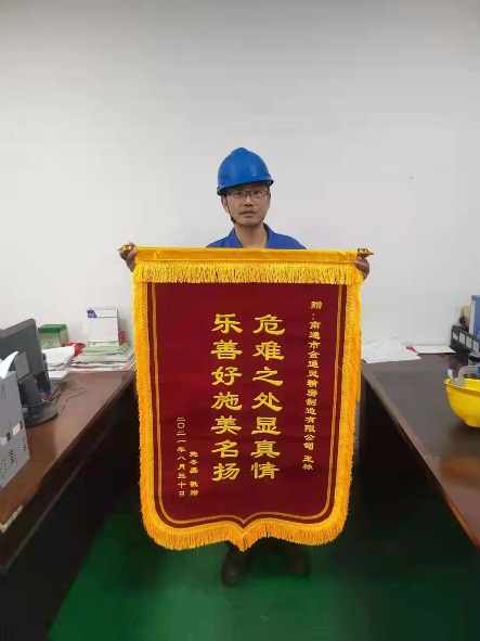 涓涓熱血,匯注生命希望,點(diǎn)滴真情,架起愛的橋梁。9月6日上午,金通靈精密制造有限公司迎來了一位特殊的客人——施先生,將一面寫著“危難之處顯真情,樂善好施美名揚(yáng)”的錦旗送到我司三車間員工王棟手中,感謝他在緊急關(guān)頭無償獻(xiàn)血,幫助施先生的家庭重獲希望。